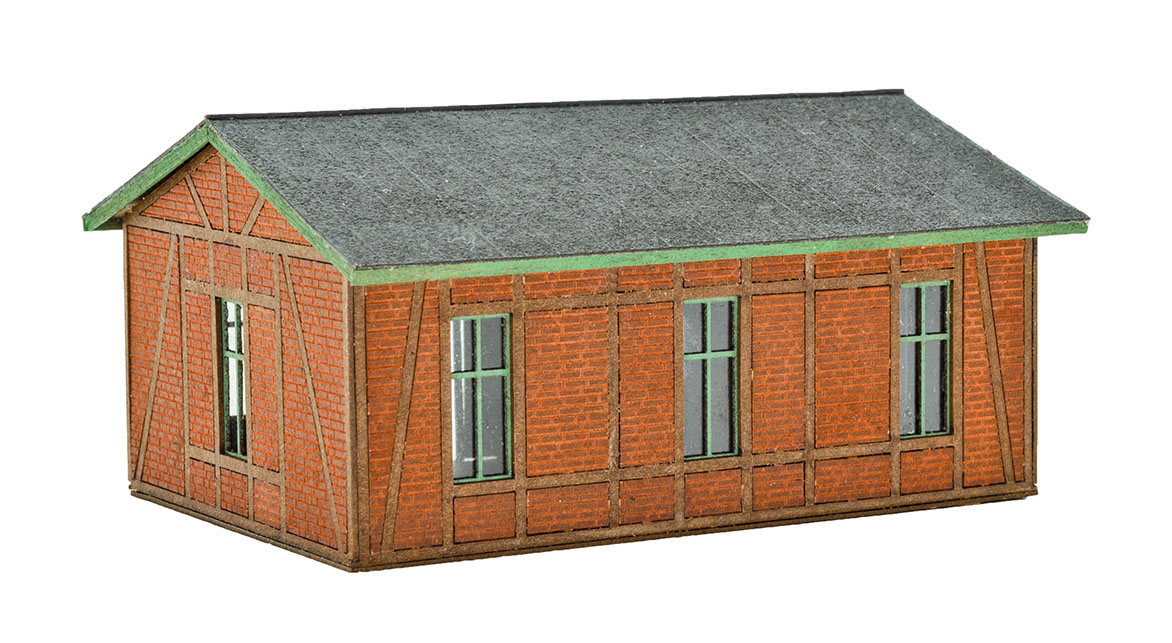 TT Werkstatt mit Ziegel-/Fachwerkfassade- Polyplate Bausatz - Zeitloses Werkstattgebäude mit Ziegel-/Fachwerkfassade aus Polyplate Verbundwerkstoff. L 7,7 x B 5,2 x H 4,0 cm.
