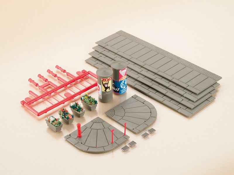 Passend zum Stadthaussortiment, für gerade und kurvenförmige Anordnung. Mit Begrenzungsstangen, Hydranten, 2 Litfasssäulen, Gullydeckeln, 2 Blumenschalen und Plakaten. Ergänzung siehe