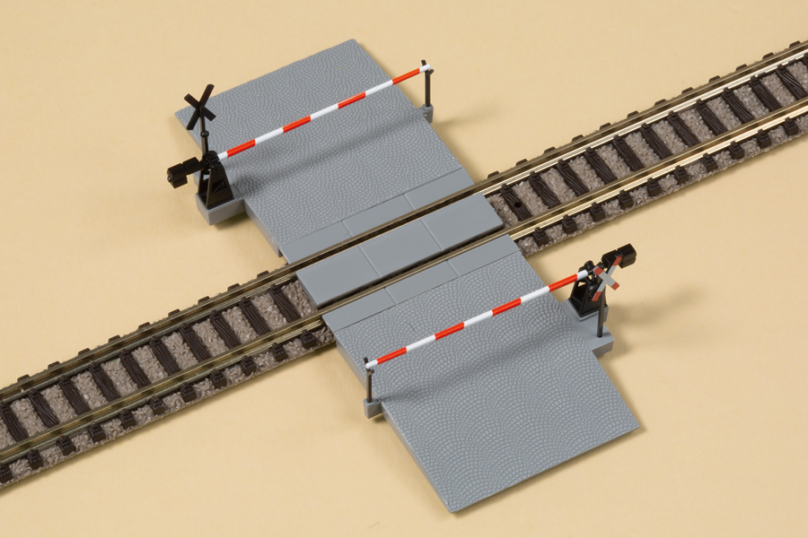 Manuell bedienbar. Durch verschiedene Einlagen für Gleisführung gerade und im Bogen verwendbar. Bei Gleisen mit Bettung, Höhe durch Unterbau ausgleichen. Straßenbreite 32 mm, Höhe Schrankenbock 8 mm.