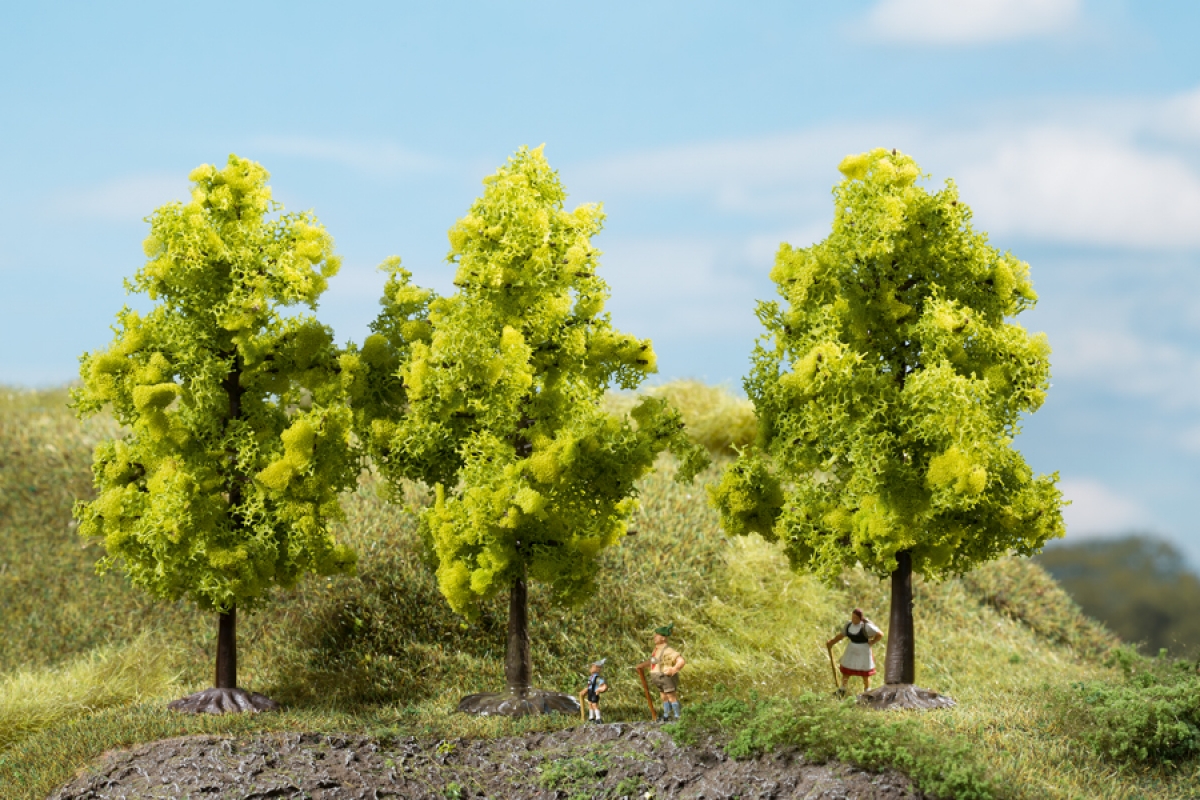 Mit dem Laubbaumsortiment in zwei Grüntönen und drei Größen können Sie eine sehr realistische Landschaft darstellen. Die Kunststoffäste sind jeweils mit zwei unterschiedlichen Schaumstoffen beflockt, was entscheidend zur Vorbildnähe beiträgt.