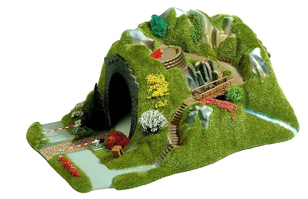 Mit Straße und Bahnübergang, Aussichtsplattform und Wasserfall mit Brücke. Für gerade Strecken.