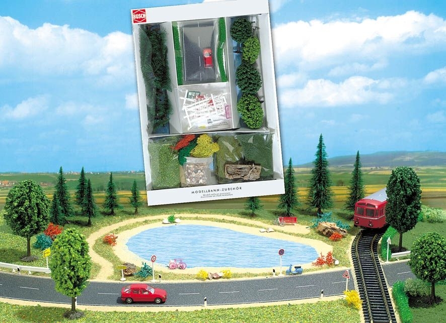 Das Komplett-Set für die Ausgestaltung Ihrer Modellbahnanlage: Laub- und Tannenbäume. Hecken. Seepapier. Verschiedene Streumaterialien, Sand und Geröllsteine. 1m Asphaltstraße inkl. Leitplanken, Verkehrsschilder und Automodell. Parkbank, 2 Fahrräder und Motorroller. Insgesamt über 50 Teile.