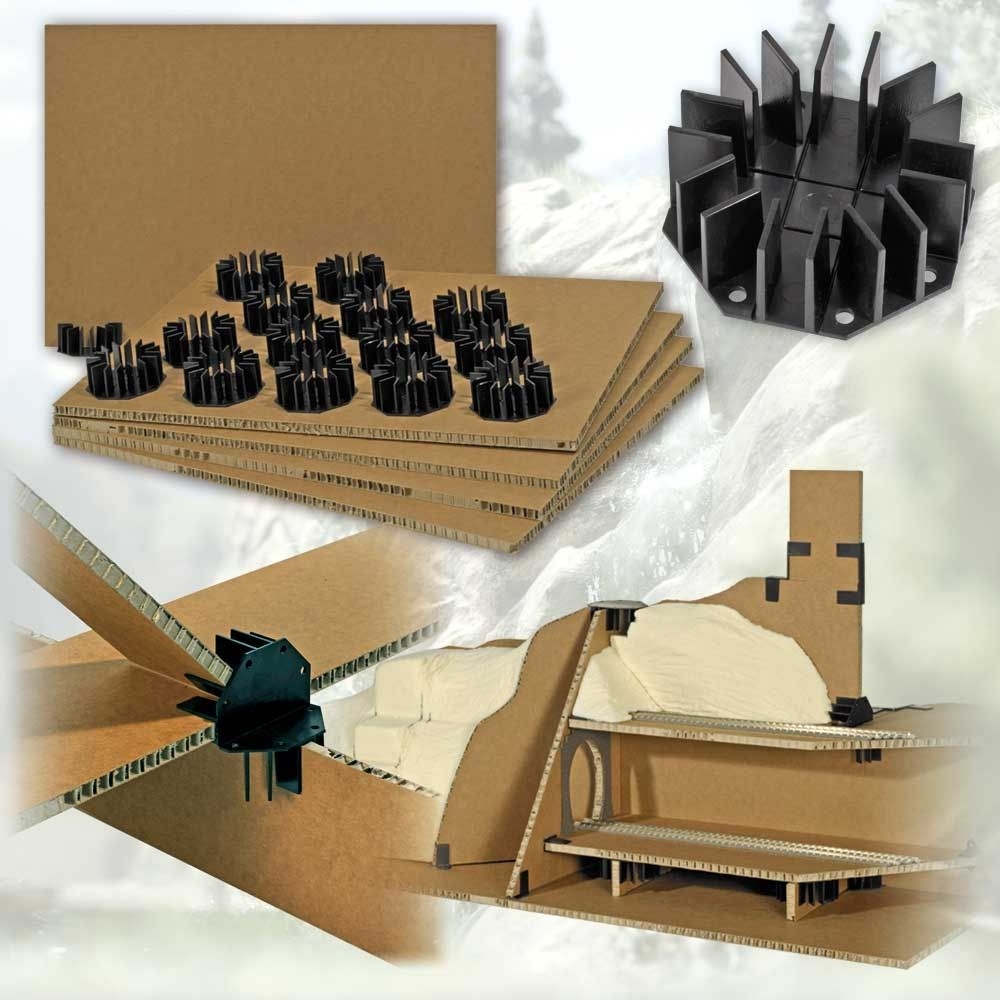 Der Mittelpunkt des Systems ist der neue »Universal-Steckverbinder« aus Kunststoff. Bis zu acht Modellbauplatten (8mm dick) können in verschiedenen Winkeln eingesteckt werden. Dadurch lassen sich horizontale Ebenen, senkrechte Wände oder Schrägen errichten.