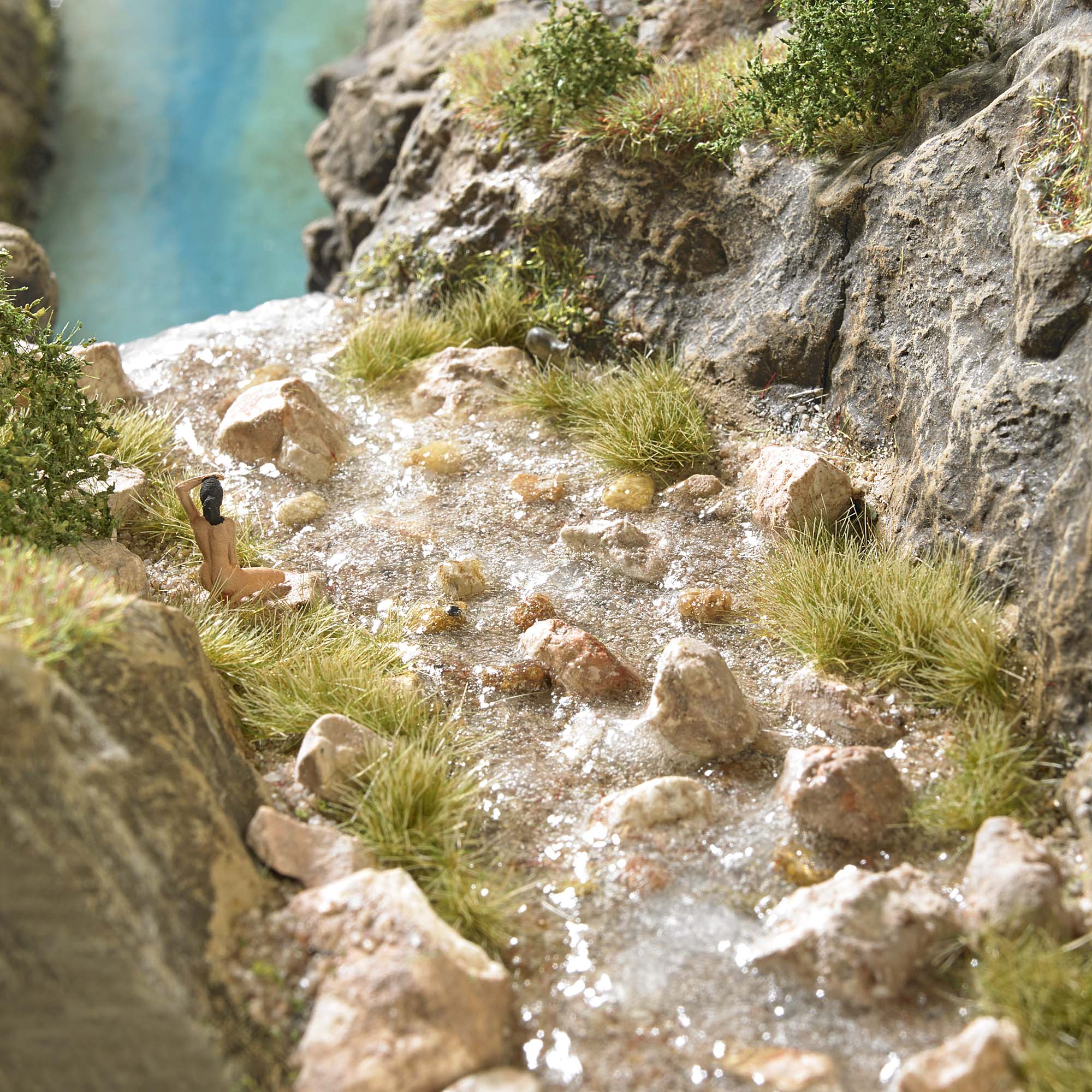 Kristallklare Gewässer, wie von der Natur erschaffen! Einfach zu gestalten mit dem flüssigen Busch Modellierwasser. Auf den vorbereiteten Untergrund (in Blautönen bemalt, evtl. mit Sand, Steinchen, Wasserpflanzen bedeckt) das Wasser schichtweise aufgießen. Je mehr Schichten, um so natürlicher die Wirkung, 5-6 Stunden Trocknungszeit pro Schicht. In die vorletzte Schicht ggfs. Boote, Figuren, Pflanzen mit eingießen. Nachdem die oberste Schicht getrocknet ist, wird die Wasseroberfläche »belebt«, d.h. mit einem Spatel oder Nagel werdenWasserbewegungen