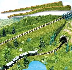 Die flexiblen Auffahrten werden als fertige Bahndammböschung mit Grasbeflockung und Schotterimitation geliefert. Die Farb- und Materialstruktur entspricht Busch Gelände-Teppichen (maigrün) und Geländeteilen, wodurch Kombinationen mit selbstgebauten Geländeabschnitten ohne sichtbare Übergänge möglich sind. Die Auffahrten sind nach allen Seiten biegbar und können mit einem scharfen Messer leicht bearbeitet werden. Das Verlegen ist denkbar einfach: Der Bahndamm wird entsprechend dem Streckenverlauf vorgebogen und kann dann mit Stecknadeln oder Klebstoffpunkten auf einer Grundplatte befestigt werden. Die Arretierung der Gleise erfolgt mit Nadeln, Nägeln oder durch Klebstoffpunkte.