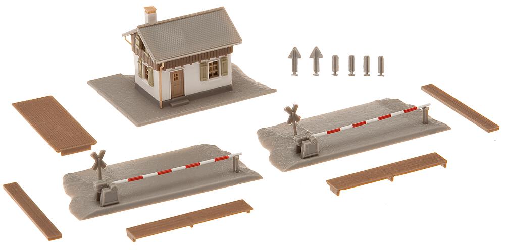 Mit Schrankenwärterhäuschen. Kann in ein- oder mehrgleisige Strecken eingebaut werden. Ohne Antrieb. Dieser Bausatz enthält: 60 Einzelteile in 5 Farben, 1 Gardinenmaske, 1 Deko und 1 Bauanleitung.