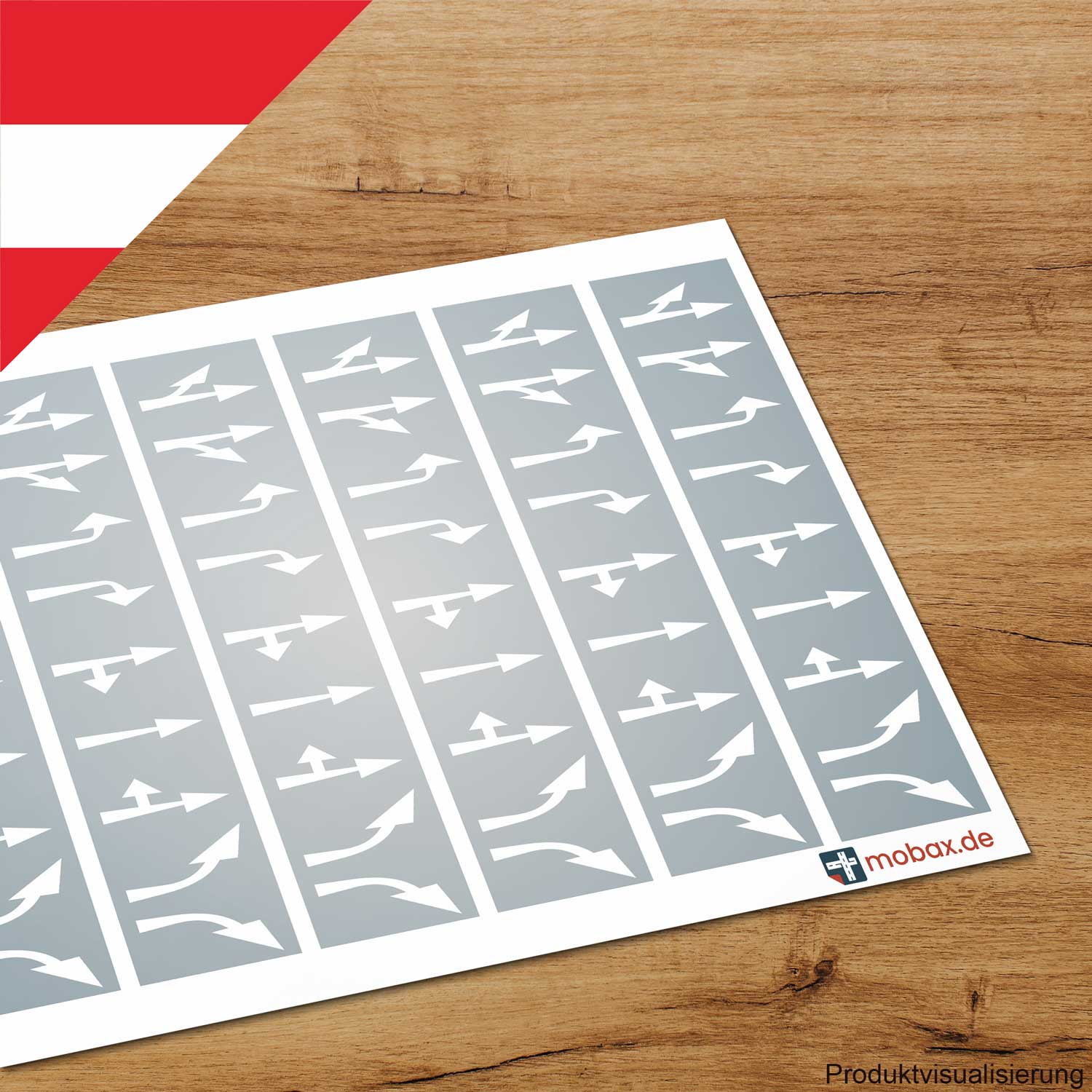 Spur N - 1:160 : Österreich - Weiß, Stadt - Pfeile-Set Ortsgebiet.Die Pfeile entsprechen der genormten Größe (Länge: 3 m) für ein Ortsgebiet. Das Set beinhaltet eine große Auswahl der gängigen Pfeilsymbole:geradeaus und halblinks 6geradeaus und halbrechts 6links ab 6rechts ab 6geradeaus und rechts ab 6geradeaus 6geradeaus und links ab 6halblinks 6halbrechts 6Für dieses Set empfehlen wir unsere Übertragungsfolie.Vorgaben aus der Norm:je Fahrstreifen sollten mind. 3 Pfeile aufgebracht werdender Abstand zwischen den Pfeilen sollte in der Regel 3 Pfeillängen betragendie Mitte der Fahrbahn sollte mit der Mitte des geraden Pfeilschaftes übereinstimmenDie Pfeillänge für das Freiland (5 m) und Autobahn (10 m) weichen ab. Ihr findet in unserem Shop auch die größere Version (5 m) für das Freiland.Anwendung:Die Pfeile lassen sich auf die individuellen Bedürfnisse anpassen und anordnen. Lassen Sie Ihrer Kreativität freien Lauf und erschaffen Sie absolut realistätsnahe Modelle.Es handelt sich um hochwertige, selbstklebende Markierungsfolie mit sehr starker Haftung. Die flexiblen Markierungen passen sich perfekt dem Untergrund an und lassen sich in nahezu jedem Kurvenradius legen. Gestochene Randschärfe der einzelnen Elemente.