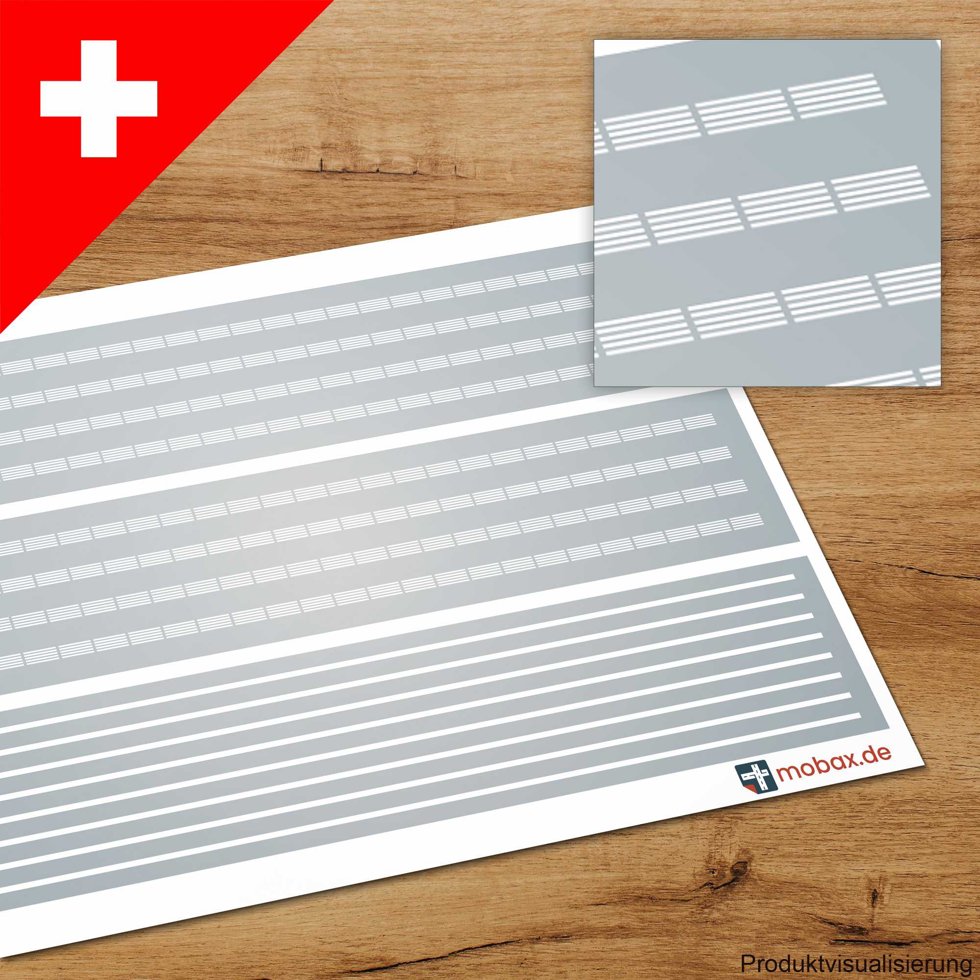 Spur H0 - 1:87 : Schweiz - Weiß, Bahnsteig - Perron / Bahnsteig Sicherheitsabstand weiß für die Schweiz.Dieses Set beinhaltet die typischen Linien für Schweizer Bahnsteige.Wir haben es endlich geschafft, die Markierungen für die Schweizer Bahnsteige in H0 zu realisieren. Da die Linien z.T. sehr filigran sind, bieten wir das Set direkt mit Übertragungsfolie an. So lassen sich die feinen Strukturen einfach und ohne Probleme auf den Untergrund übertragen. Die Aufteilung der Linien ist auf dem Produktfoto ersichtlich und weicht aufgrund technischer Limitationen nur leicht vom Original ab (5 statt 6 Streifen). Ein Unterschied ist in der Praxis nicht zu erkennen.Ein Set ergibt eine Gesamtlänge von 2,17 m. Anwendung:Es handelt sich um hochwertige, selbstklebende Markierungsfolie mit sehr starker Haftung. Die flexiblen Markierungen passen sich perfekt dem Untergrund an. Flexibel in nahezu jedem Kurvenradius zu legen. Gestochene Randschärfe der einzelnen Elemente.
