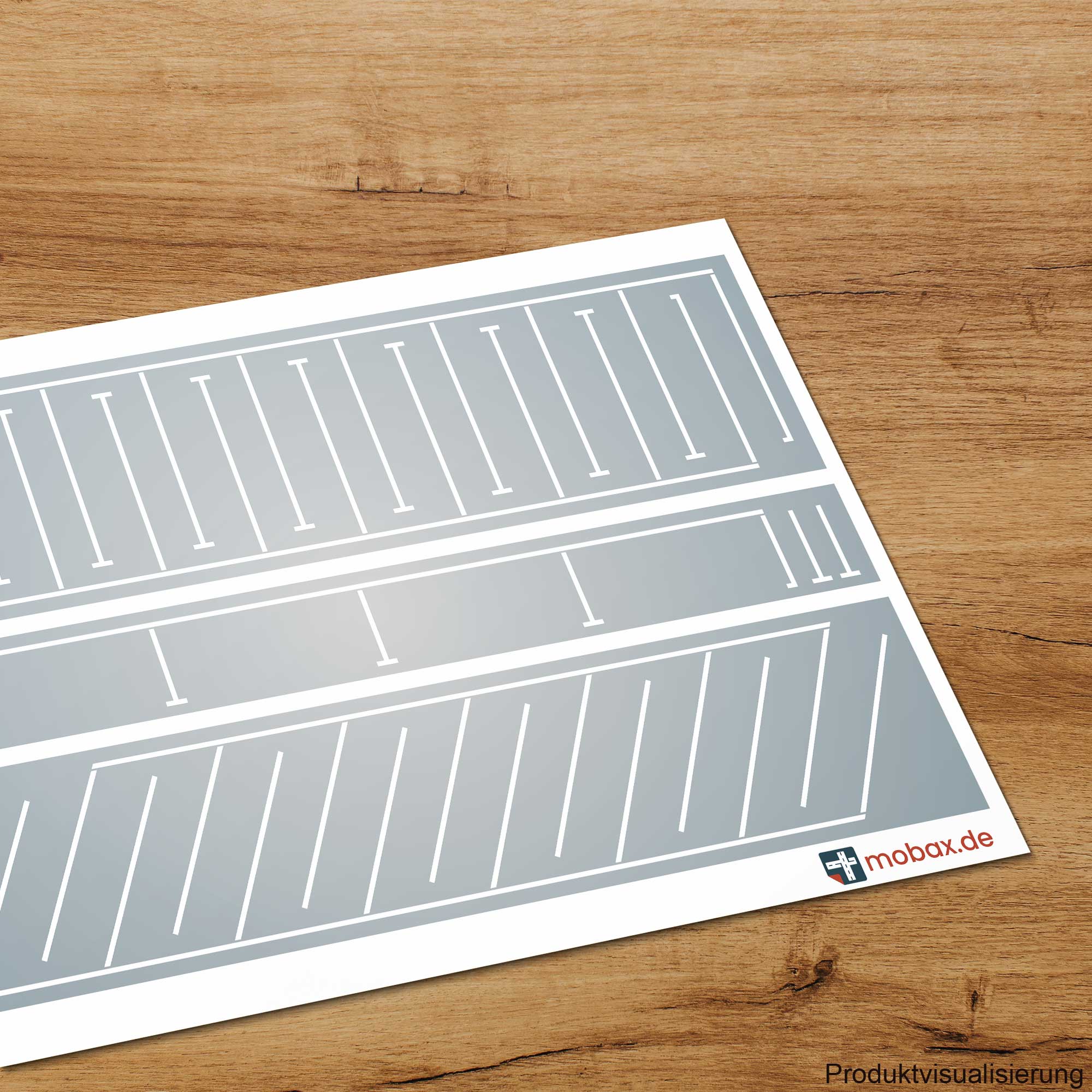 Spur N - 1:160 : Deutschland, Österreich, Schweiz - Weiß, Stadt, Landstraße - Parkplatz-Set für innerorts und Landstraße.Die Markierungen entsprechen der genormten Größe für Innerorts und Landstraße.Parkplatz normal - 17Parkplatz Seitenstreifen + weitere Begrenzungen - 4 + 4Parkplatz schräg - 13Längs- und Querstreifen können frei auf die benötigten Maße zugeschnitten und arrangiert werden.Für dieses Set empfehlen wir unsere Übertragungsfolie.Anwendung:Die Linien lassen sich auf die individuellen Bedürfnisse (Parkplatzlänge und -breite) anpassen, anordnen und zuschneiden. Lassen Sie Ihrer Kreativität freien Lauf und erschaffen Sie absolut realistätsnahe Modelle.Es handelt sich um hochwertige, selbstklebende Markierungsfolie mit sehr starker Haftung. Die flexiblen Markierungen passen sich perfekt dem Untergrund an und lassen sich in nahezu jedem Kurvenradius legen. Gestochene Randschärfe der einzelnen Elemente.