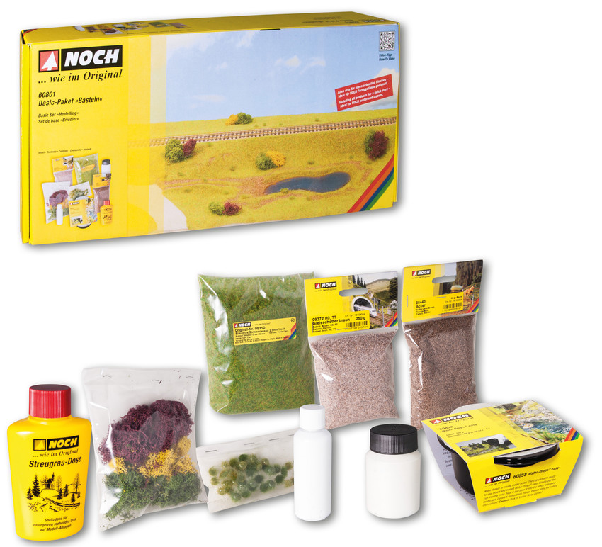 Inhalt: Gleisschotter, 250 g Boden-Strukturpaste grau, 100 g Water-Drops easy, 125 g Gras-Kleber, 50 g Gras-Spritzdose, Streugras Sommerwiese (Länge der Grasfasern 2,5 mm), 40 g Streumaterial Acker, 42 g Moos grün, 20 g Grasbüschel, gemischt (40 Stück)
