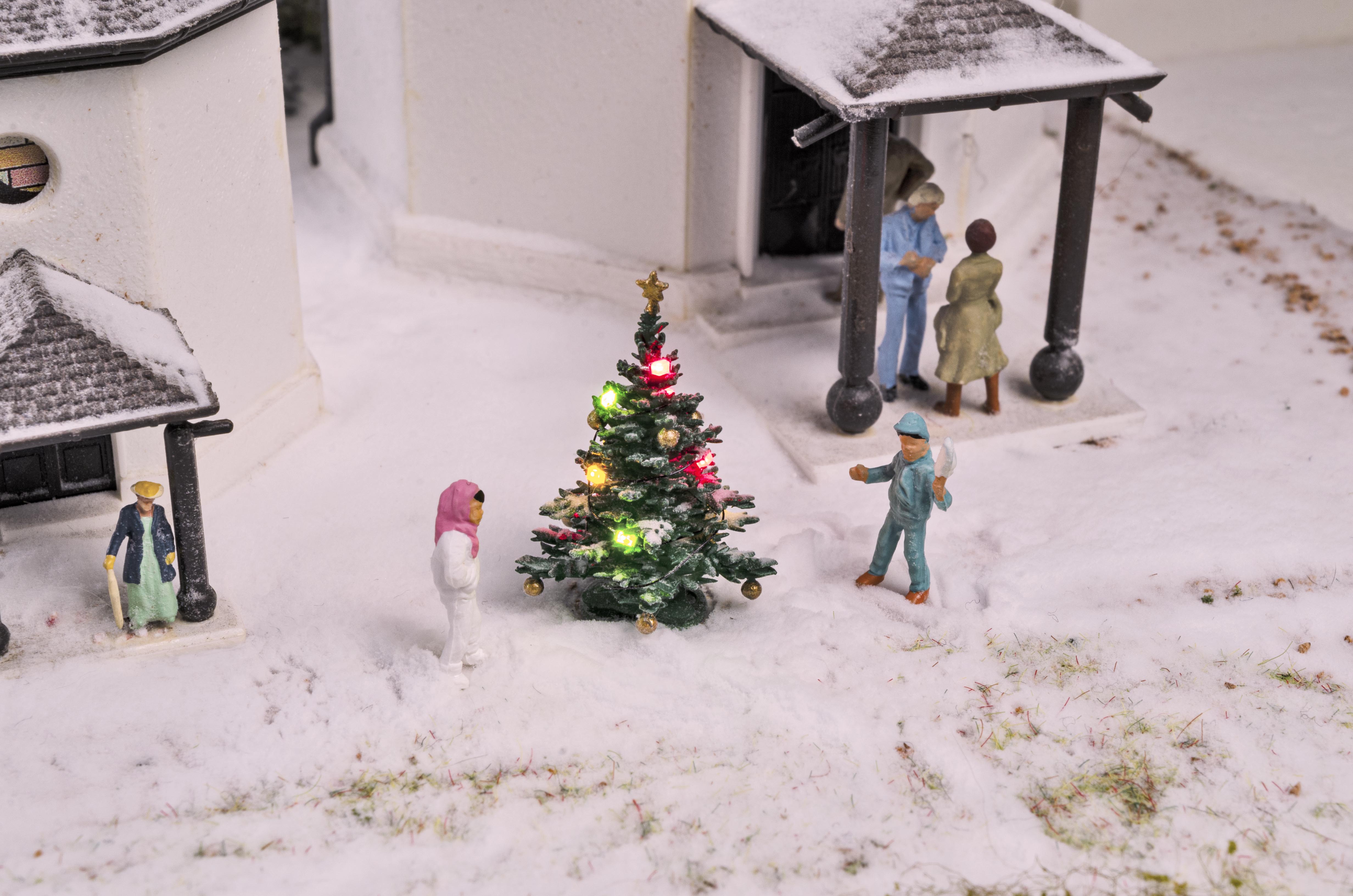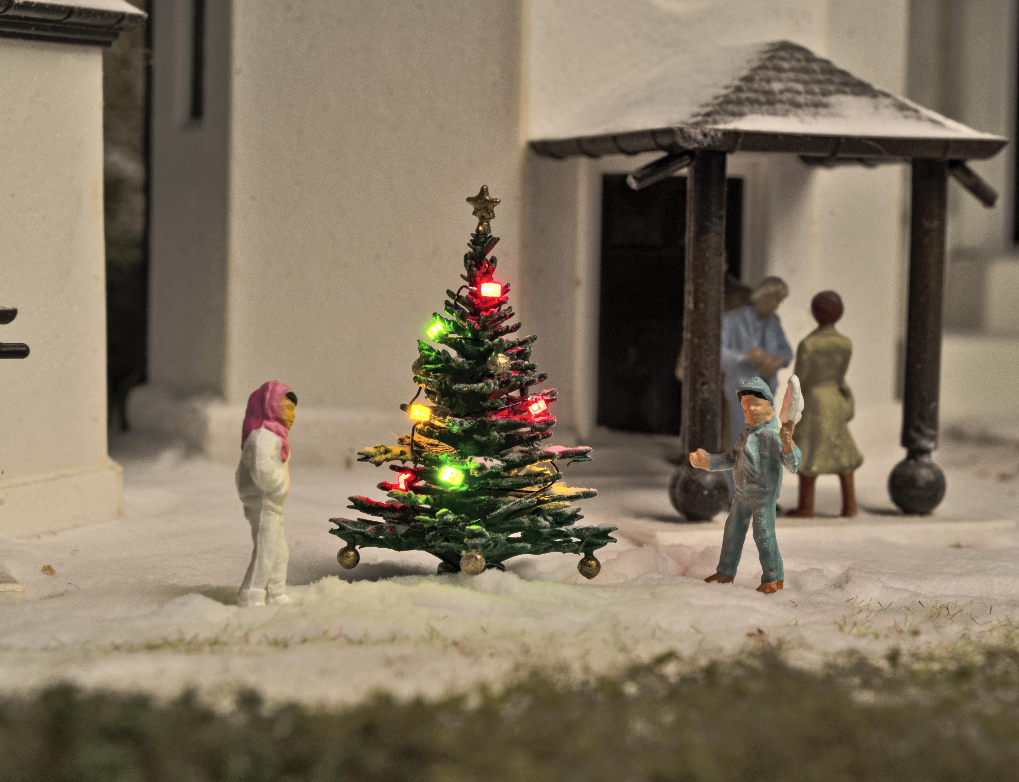 Dieser einzigartige, im 3D Druck erstellte Weihnachtsbaum überzeugt durch seine filigranen Äste, beschmückt mit handbemalten goldenen Kugeln und originalgetreuer bunter Lichterkette. Die Lichterkette wird, wie beim Original, händisch um den Baum gewickelt und dadurch strahlt jeder Baum ganz individuell zum nächsten Weihnachtsfest! Der Weihnachtsbaum kann spurgrößenübergreifend bzw. spurgrößenunabhängig verwendet werden. Höhe: 2,9 cm.