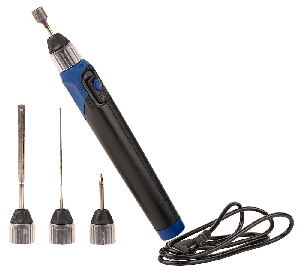 Vielseitiges Werkzeug mit auswechselbaren Spitzen für das kabellose Löten, Heißschneiden und Heißschrumpfen. Mit LED-Beleuchtung. Enthält 4 Spitzen: Lötspitze, 12 W. Schaummodellierer, Stiftspitze, 1,2 mm. Schaumschneider, Klingenspitze, 5 mm. Spitze für Heißschrumpfung, 16 W. USB-Ladekabel für Akku beiliegend. 3,7 V, 2400 mAh Li-Ion-Akku.