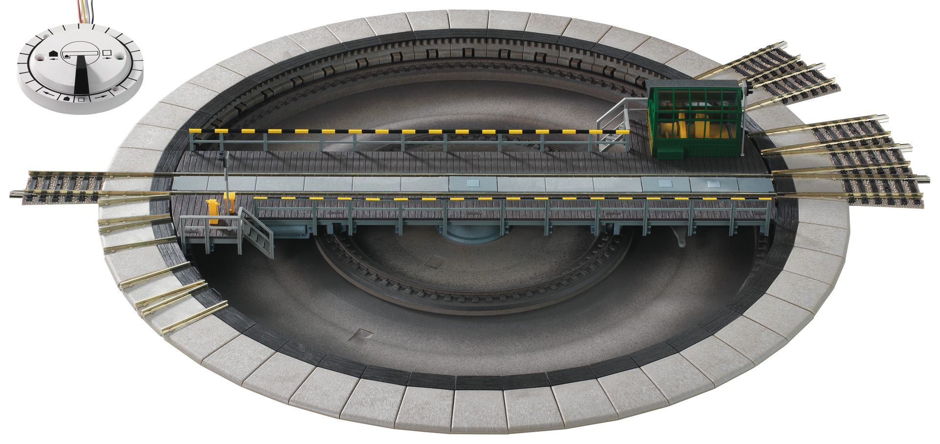 Die "denkende" Drehscheibe: Mit dem Schalter 6910 wird die Drehbewegung der Drehscheibe gesteuert, um den entsprechenden Gleisabgang zu erreichen. Die Fahrstrom-Einspeisung erfolgt in die Drehbrücke. Der gewünschte Gleisabgang, mit dem die Drehbrücke verbunden ist, wird mit dem Schalter elektrisch zugeschaltet. Alle anderen Gleisabgänge (auch ein gegenüberliegender) sind dann automatisch stromlos. Somit können maximal 48 Gleisabgänge angesteuert und elektrisch einzeln zugeschaltet werden, ohne dass eine zusätzliche Verdrahtung erforderlich ist.