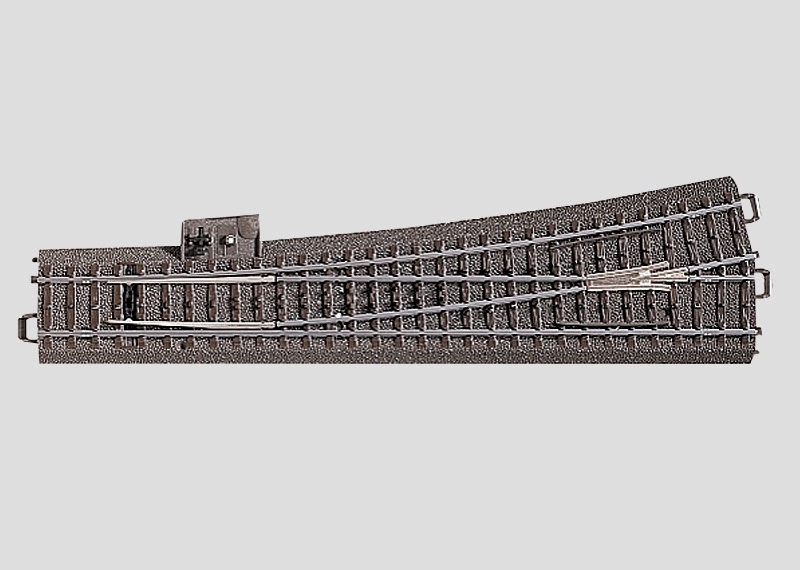 Länge 236,1 mm. Zweiggleisradius 1114,6 mm. Weichenbogen 12,1°. Herzstück 10° aus Metall. Am Ende der Weiche werden 2 Gleise 24071 benötigt, ein passendes Böschungsteil liegt bei. Mit Handschalthebel. Elektroantrieb 74490, Weichenlaterne 74470 und Digital-Decoder 74460 nachrüstbar.