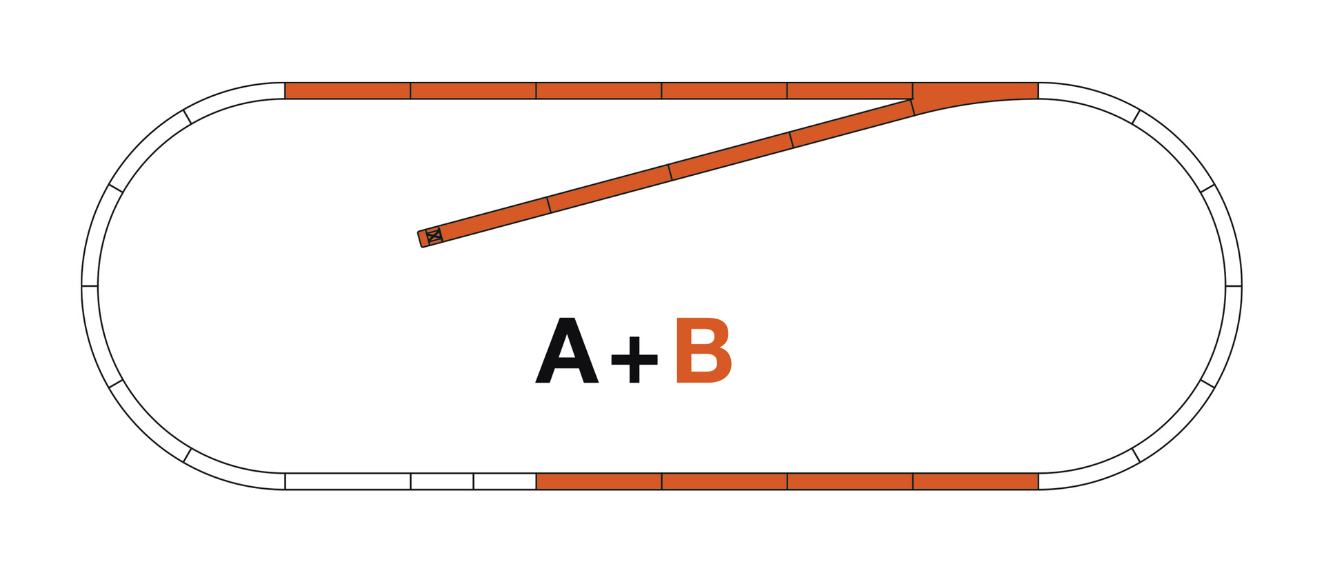 Die Mindestkonfiguration Gleisset A ist in allen Start Sets mit ROCO LINE-Bettungsgleis enthalten und nicht als Einzelset erhältlich. Alle weiteren Gleissets bauen auf dieser Zusammenstellung auf. (A+B)