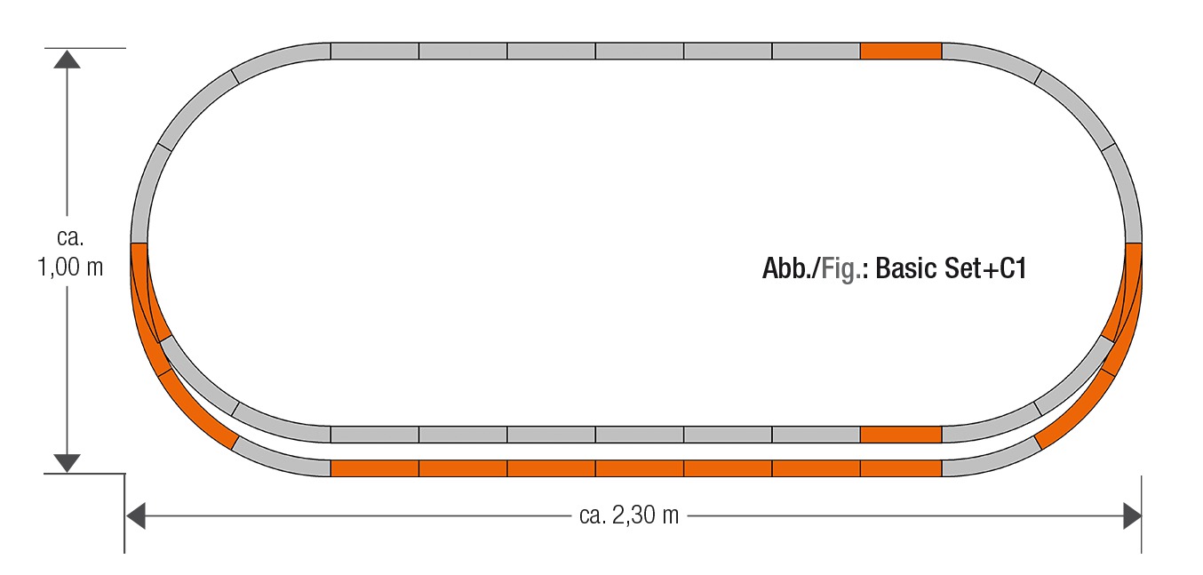 GeoLine Gleisset C1. Inhalt: 6x Gerade G200, 3x Gerade G185, 2x Bogengleise R3, 1x Handbogenweiche links, 1x Handbogenweiche rechts. Platzbedarf ca. 230 x 100 cm.