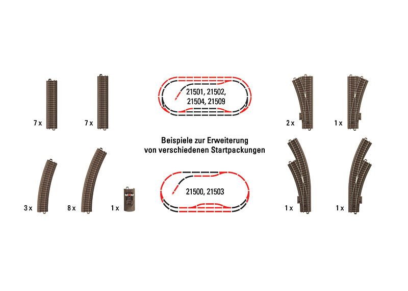 Inhalt: 7 x 62172 gerades Gleis 171,7 mm 7 x 62188 gerades Gleis 188,3 mm 3 x 62224 gebogenes Gleis R 2 / 24,3° 8 x 62230 gebogenes Gleis R 2 / 30° 2 x 62611 Weiche links 24,3° 1 x 62612 Weiche rechts 24,3° 1 x 62671 Bogenweiche links 30° 1 x 62672 Bogenweiche rechts 30° 1 x 62977 Prellbock 80,5 mm