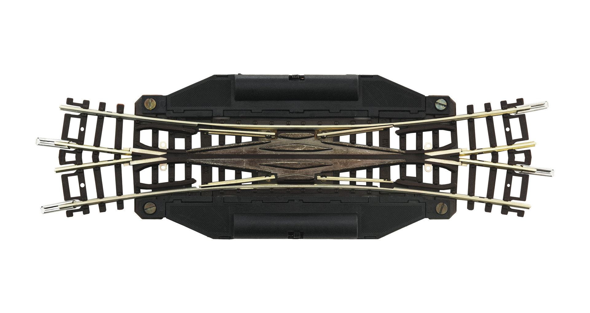 Elektro-Kreuzungsweiche 15°. Länge der Gleisstränge 129,8 mm, Kreuzungswinkel 15°.