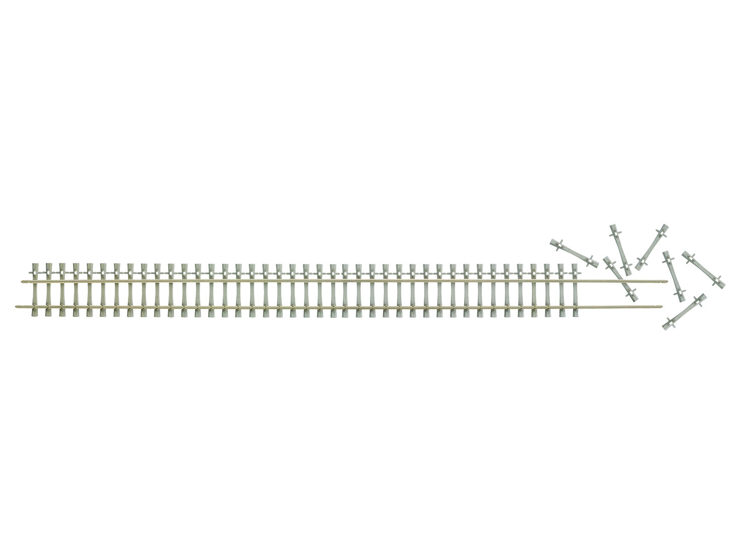 Bausatz zur vorbildrichtigen Nachbildung von Betonschwellengleisen. Inhalt: 2 Schienenprofile 900 mm lang aus Neusilber, 48 Betonschwellen aus Kunststoff und 6 Schienenverbinder.