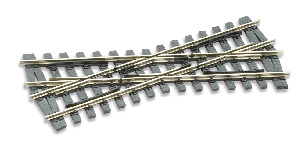 Die Kurze Kreuzung hat den doppelten Winkel der anderen Gleiskomponenten in diesem Sortiment; sie kann mit 4 Weichen mit mittlerem Radius (SL-E1495/6) verwendet werden, um eine Scherenkreuzung zu bilden, oder sogar komplexere Formationen mit der SL-E1490 Doppelrutsche.