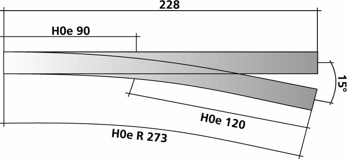 Abzweig rechts H0-H0e, Abzweig 15°, Radius 273, Länge 228 mm.