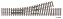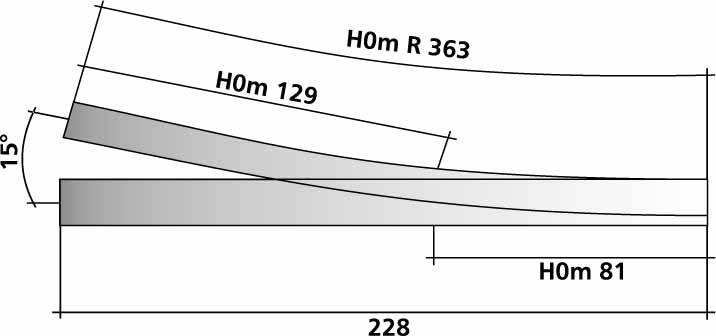 Abzweig links H0-H0m, Abzweig 15°, Radius 363, Länge 228 mm.