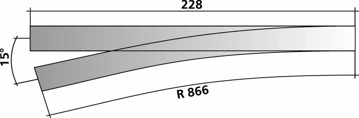 Hand-Weiche links, Herzstückwinkel 11°, Abzweig 15°, Radius 866, Länge 228 mm.