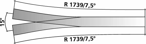 Außenbogenweiche (symmetrisch), Herzstückwinkel 11°, Abzweig 15°, Radius 1.739.