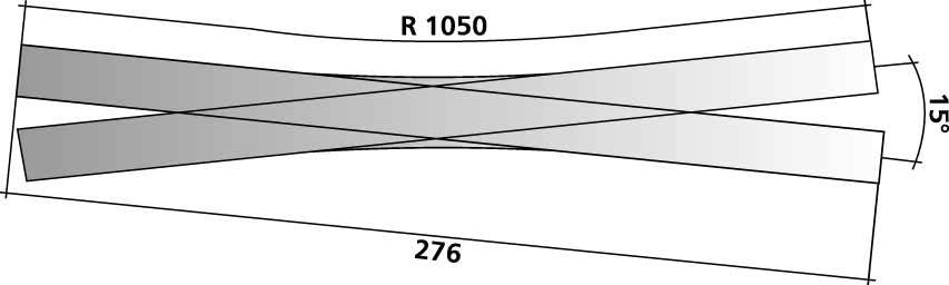 Doppelkreuzungsweiche (Bauart Baeseler) 15°, Radius 1.050, Länge 276 mm.
