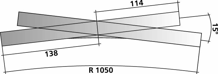 Einfachkreuzungsweiche 15° R 1050 mm, Länge 252 mm.