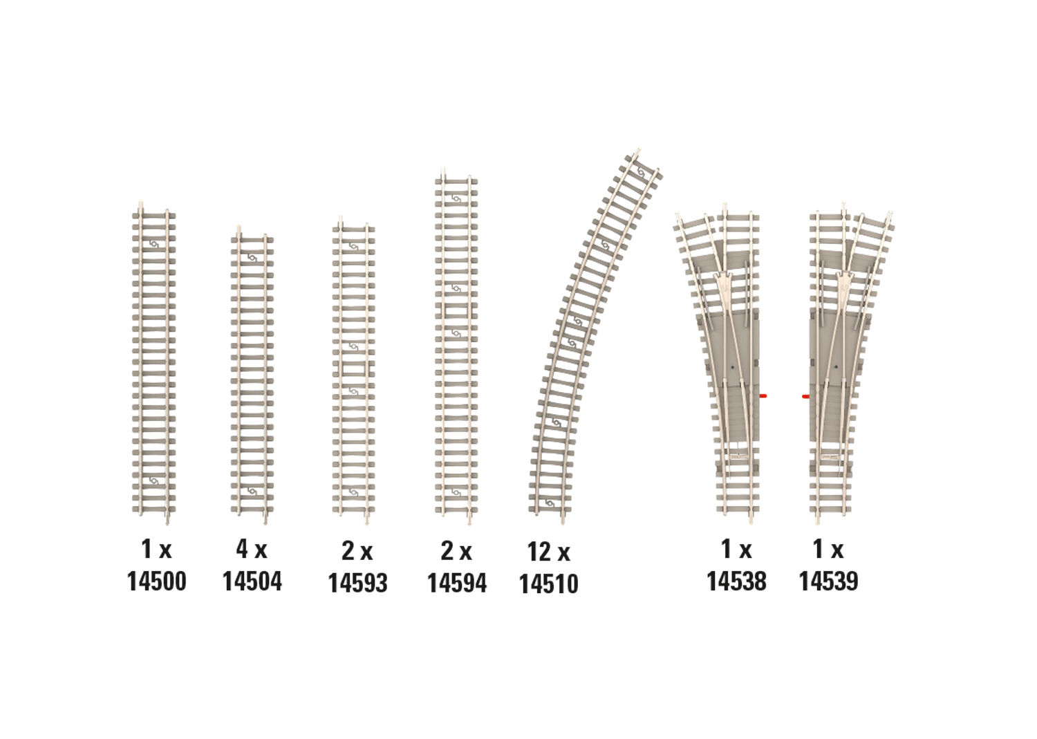 Gleis-Ergänzungs-Set B2 - Das Gleis-Ergänzungs-Set B2 erweitert das Gleisbild der aktuellen Startpackungen, welche bereits mit dem Gleis-Ergänzungs-Set B1 ausgestattet wurden. Stufenlos erweiterbar mit dem gesamten Minitrix-Betonschwellen-Gleisprogramm. Alle Weichen können nachträglich mit den Elektroantrieben 14534/14535 ausgestattet werden.Inhalt: 1 x 14500 gerades Gleis 112,6 mm. 4 x 14504 gerades Gleis 104,2 mm. 2 x 14593 gerades Gleis 108,4 mm. 2 x 14594 gerades Gleis 126,3 mm.12 x 14510 gebogenes Gleis R 2a – 30°. 1 x 14538 Weiche links R 4 - 15° mit polarisiertem Herzstück. 1 x 14539 Weiche rechts R 4 - 15° mit polarisiertem Herzstück.Beispiel zur Erweiterung: 11161 und 14321 mit 14322 (Außenabmessungen: ca. 139 x 53 cm) Empfohlene Plattengröße: 150 x 60 cm / 60“ x 24“