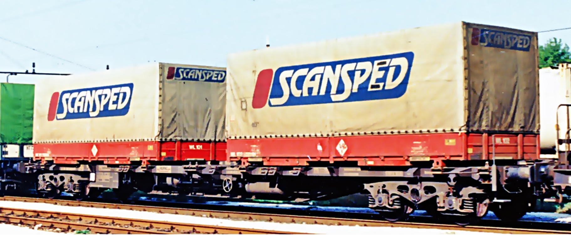 60 Fuß Intermodal-Wagen vom Typ Sgnss 60 der DSB, beladen mit zwei "SCANSPED" Wechselpritschen, für die Epoche 4/5.