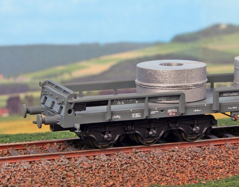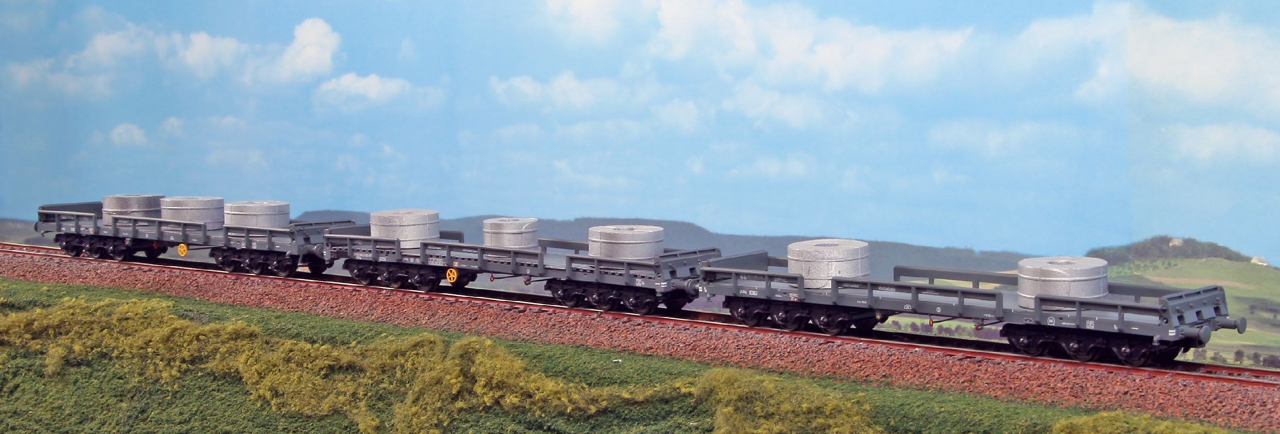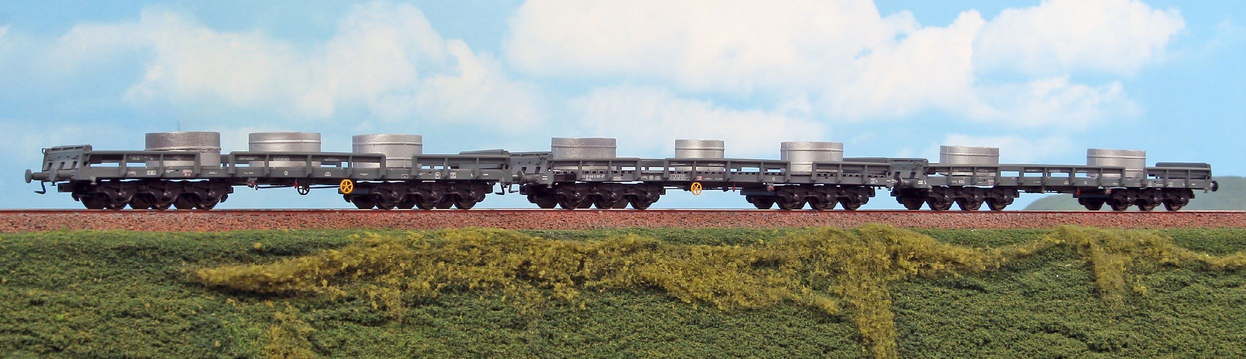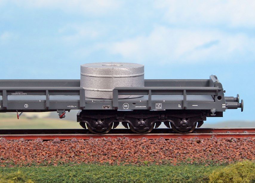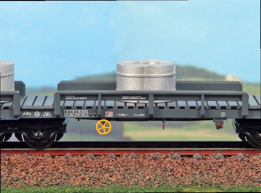 Set "Italsider-Zug" bestehend aus drei Sa-Privatwagen für den Transport von Coils in unterschiedlicher Lackierung und Betriebsnummern, wie sie in den 80er Jahren zwischen den wichtigsten Eisen- und Stahlzentren Genua, Taranto, Piombino, Pozzuoli und den wichtigsten italienischen Industrien im Einsatz waren. Die Waggons sind mit Coils in unterschiedlicher Gõße beladen. Epoche IV-V.