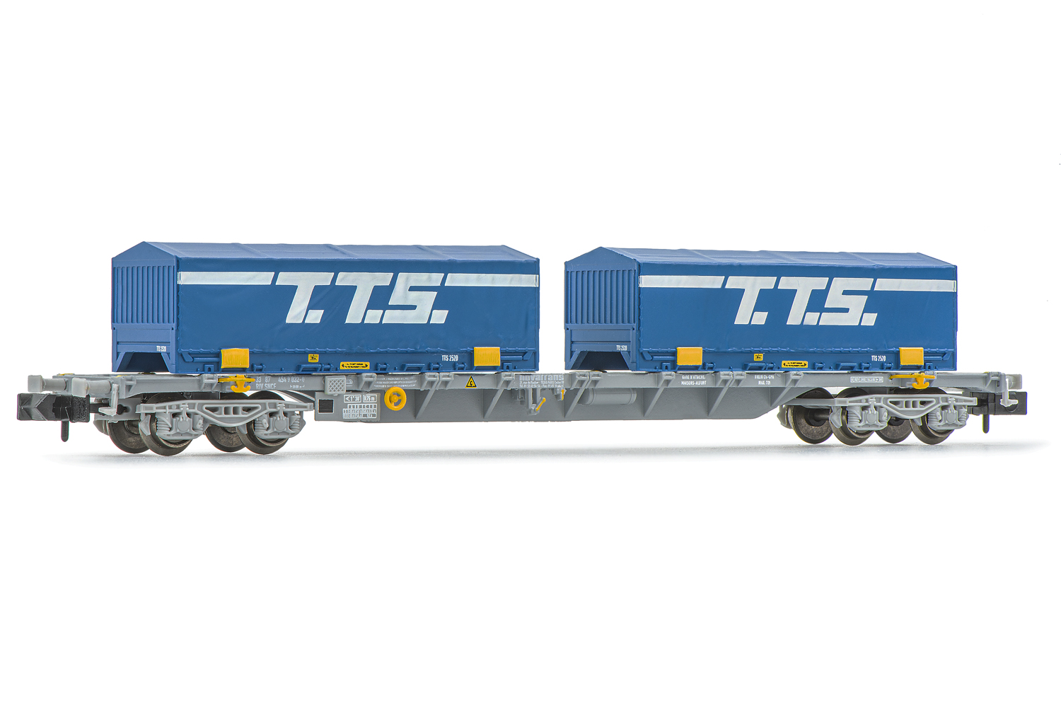4-achsiger 60' Containertragwagen Typ Sgss, grau, der SNCF/Novatrans, beladen mit 2x 22' Container T.T.S., für die Epoche 5.
