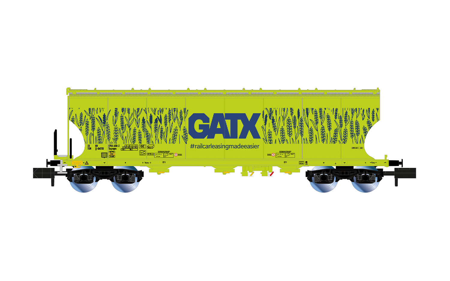 D-GATX, 4-achs. Getreidesilowagen mit runden Seitenwänden, neongrüne "Getreide-Ähren"“-Farbgebung, großes "GATX"“-Logo -