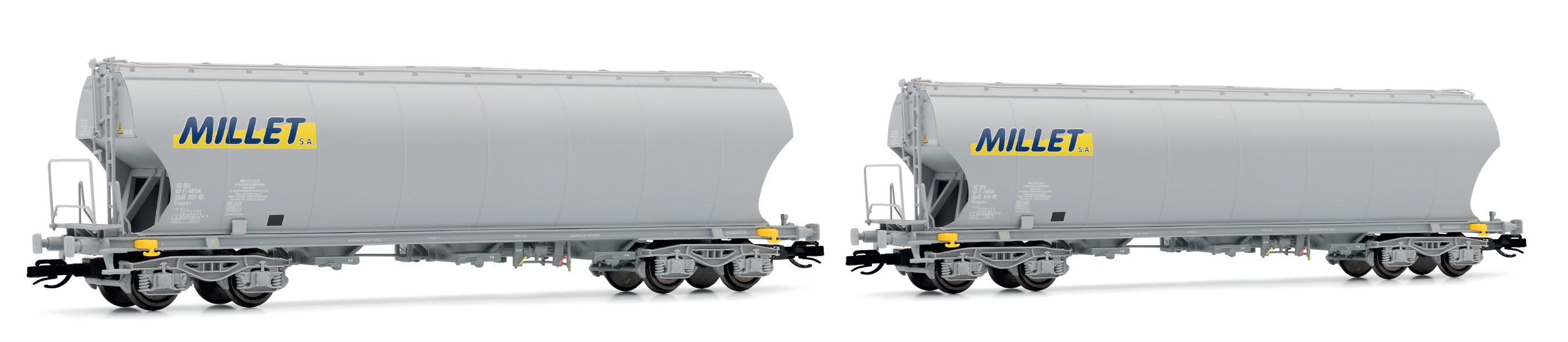 Set aus zwei 4-achsigen Silowagen mit gewölbten Seitenwänden in der grau lackierten Millet-Ausführung. Perfekte Ergänzung für moderne Güterzugkompositionen.