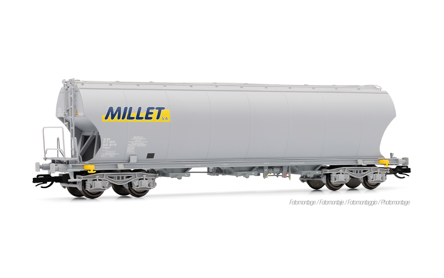 F-MISA, 2-tlg. Set 4-achs. Getreidesilo-Wagen mit runden Seitenwänden, "MILLET", grau Lackierung -