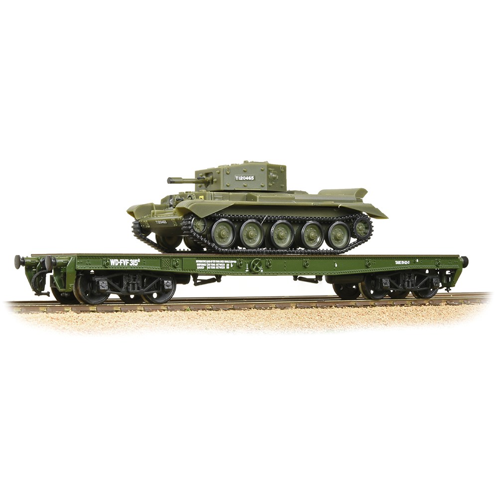 Flachwagen, beladen mit einem Panzer des War Departments, eingestellt bei der British Rail für die Epoche 2.