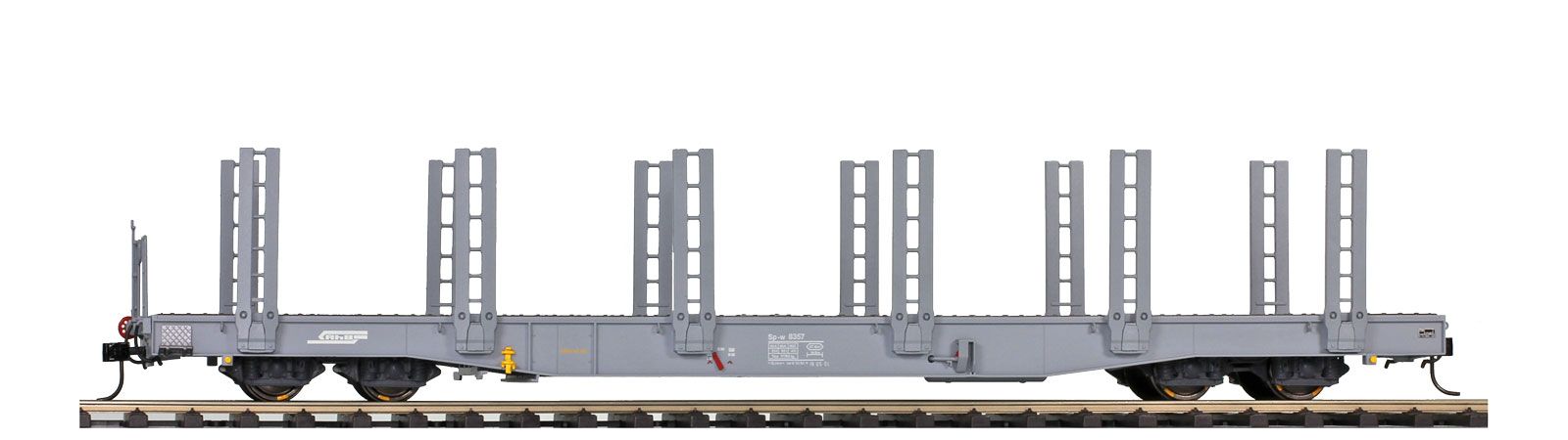 Als erstes Drehgestell-Güterwagenmodell produzieren wir die 1993 für den Bau des Vereina-Tunnels beschafften Plattformwagen Rp-w 8351-8360. Sie wurden anfangs überwiegend im Ganzzugbetrieb mit auffällig gelben Vereina-Aushubmulden im Prättigau zwischen Klosters und Untervaz eingesetzt und 1997 nach der Montage von sechs Doppelrungen pro Wagenseite für den Transport von Stammholz vorbereitet. 2004 erfolgte die Umzeichnung zu Sp-w, ab 2006 wurden zusätzlichen Stirngriffstangen für den Verschub nachgerüstet. Wir bieten je zwei beladene bzw. unbeladene Rungenwagen im Zustand zwischen der Bestückung mit Doppelrungen, jedoch ohne die stirnseitigen Rangiergriffstangen an.