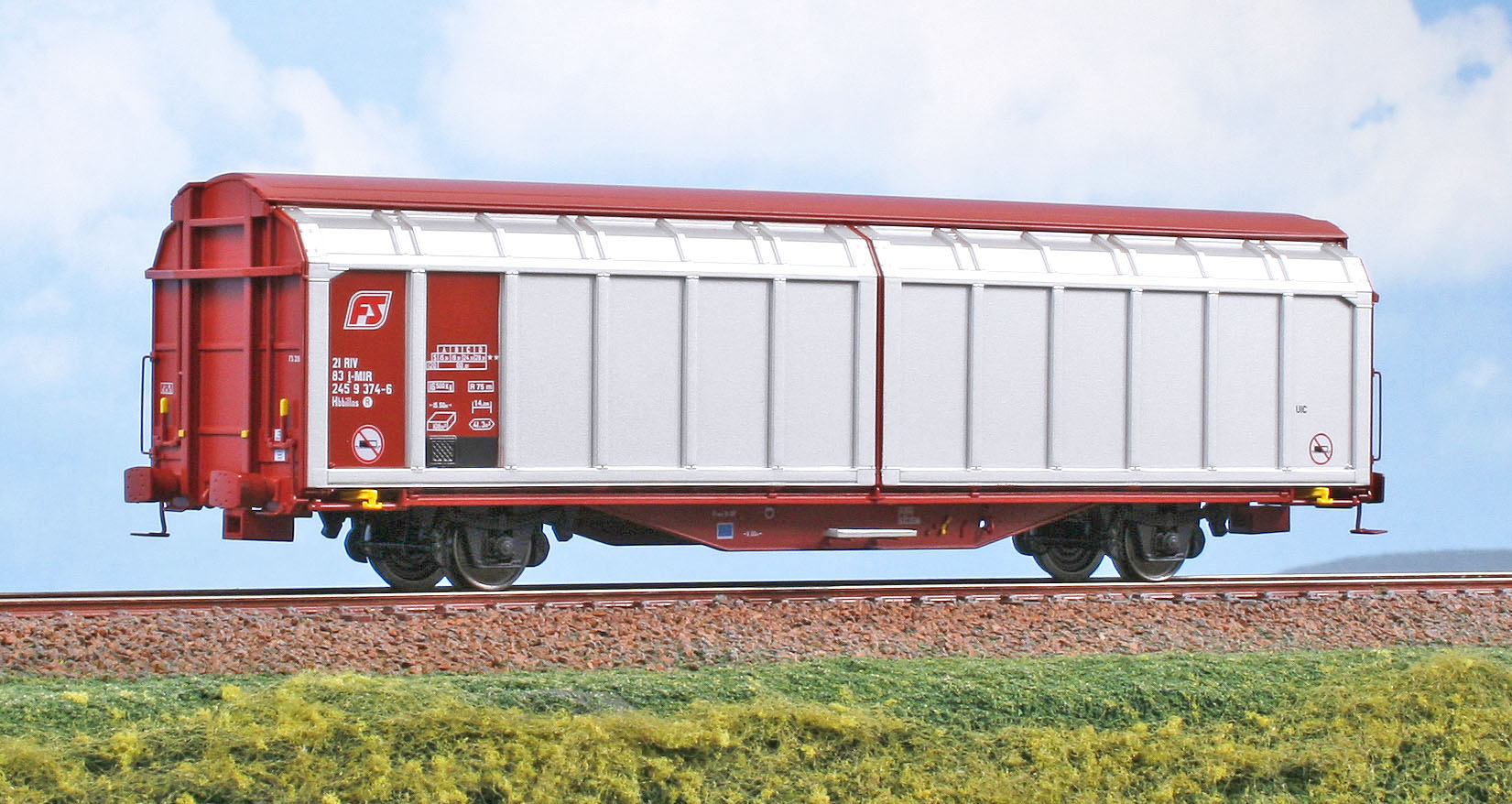 Schiebewandwagen Typ Hbbillns, geneigtes rotes Logo FS, Markierung I-TI, für die Epoche 5/6.
