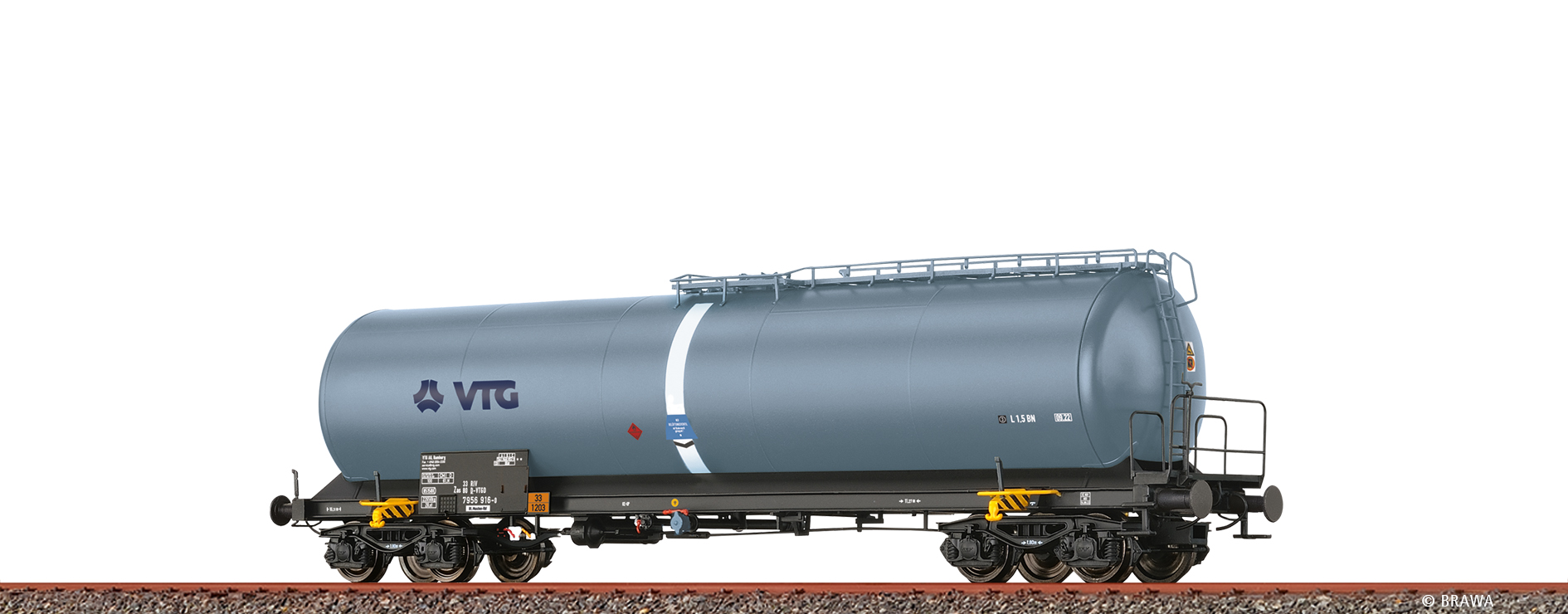H0 Neubaukesselwagen 4-achsig Zas VTG - Epoche VI - Betriebsnummer 33 80 7956 916-0- Präzise Bedruckung und Lackierung - Extra angesetzte Bremsanlage - Laufgitter geätzt - Extra angesetzte Geländer - Fein detailliertes Y-25 Drehgestell - Bremsbacken in Radebene - Länge über Puffer: 187,5 mm - Kurzkupplungskinematik: eingebaut - Vorbild: In den 70er-Jahren produzierten die Werke der DDR-Waggonbauindustrie fast ausschließlich für den Export. Die DR musste sich daher anderweitig umsehen, um den alternden Wagenpark zu ersetzen und mehr Fahrzeuge für die gestiegenen Transportaufgaben zu Verfügung zu haben. Teilweise gelang Abhilfe durch die Fertigung von Neubauwagen in eigenen Raw, aber für Spezialwagen bot sich diese Technologie nicht an.$$Anfang der 70er-Jahre gelang es dem Außenhandelsministerium der DDR mit Frankreich umfangreiche Kompensationsgeschäfte abzuschließen, in deren Folge die DR ca. 20 000 Neubaugüterwagen verschiedener Gattungen erhielt. Darunter wurden ab 1975 1250 vierachsige Mineralölkesselwagen geliefert, die unter der Dokumentationsnummer 8105 und der Gattung Uahs eingereiht wurden. Ihr Nummernkreis begann bei 727 0000. Der Wagen besaß ein geschweißtes Untergestell aus St 52-3 ohne Mittellangträger mit Drehgestellen des Typs Y25Cs und einer geteilten Zugeinrichtung. Der fünfschüssige Behälter aus 7 mm Stahlblech(9 mm im Bodenbereich), hat ein Volumen von 85150 Litern und erlaubt damit die vollständige Ausnutzung der damals höchstzulässigen Radsatzlast von 20 t.$$Die Druckluftbremse der Bauart KE-GP mit Bremsgestängesteller und mechanischer Lastabbremsung wurde durch eine bühnenbedienbare Handbremse ergänzt und entsprach dem damaligen Stand der Technik. Die Wagen kamen vor allem in Ganzzügen zum Einsatz und dienten insbesondere dem Transport von Kraftstoffen wie Benzin und Diesel. Da die DDR diese zur Devisengewinnung auch exportierte, kamen die Wagen mit solchen Verkehren auch in das äNSW – Nichtsozialistische Wirtschaftsgebiet“. VTG ist ein eingetragenes Warenzeichen.