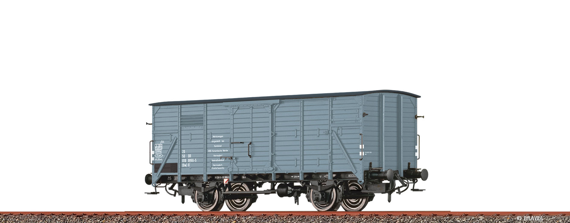 H0 Gedeckter Güterwagen (Gw) G Werkswagen Keramische Werke Hermsdorf DR - Epoche IV - Betriebsnummer 20 50 010 0066-5- Feinere Nachbildung der Bretterfugen - Optimale Dreipunktlagerung - Mehrteilige Kkg-Bremsanlage - Vorbildgerechter Rahmenaufbau - Extra angesetzte Signalhalter - Bremsbacken in Radebene - Durchbrochene Wagenkastenstützen - Präzise Bedruckung und Lackierung - Extra angesetzte Achslagerdeckel - Länge über Puffer: 107,2 mm - Kurzkupplungskinematik: eingebaut - Vorbild: Der 1909 gegründete Deutsche Staatsbahnwagenverband (DWV) entwickelte auf Basis der bestehenden gedeckten Länderbahngüterwagen mit 4,5 m Radstand und 15 t Ladegewicht den Verbandswagen Bauart A2. Dieser wurde ab 1911 in etlichen Serien für die Länderbahnen, Privatbahnen und später auch die Reichsbahn gebaut, sodass für 1934 allein für die Deutsche Reichsbahn Gesellschaft die sagenhafte Gesamtstückzahl von 121.770 G Kassel/München verbucht wurde. Zusammen mit den Wagen für private und ausländische Eisenbahnen geht man heute davon aus, dass mehr als 160.000 Wagen nach den Grundlagen des Musterblattes A2 gebaut wurden. Ab 1938 sind die Wagen verstärkt worden, um die Belastungen durch Einbau von Druckluftbremsen und die erhöhten Geschwindigkeiten aufzufangen. In den Endfeldern wurden Diagonalstreben eingeschweißt, zum Teil wurden die Stirnrungen um 90 Grad gedreht. Zum Jahresende 1952 waren bei der Deutschen Bundesbahn immer noch 35.600 Stück der nun als G10 bezeichneten Wagenbauart im Einsatz. Durch Umbauten in Gms54, allgemeine Erneuerung der Fahrzeugparks und damit verbundenen Ausmusterungen schrumpfte der Bestand kontinuierlich. 1976 schied dann der letzte, jetzt Gklm191, aus dem Unterhaltungsbestand aus. Viele Wagen blieben aber als Bahnhofs oder Werkstattwagen weiterhin erhalten. Keramische Werke Hermsdorf ist ein eingetragenes Warenzeichen.