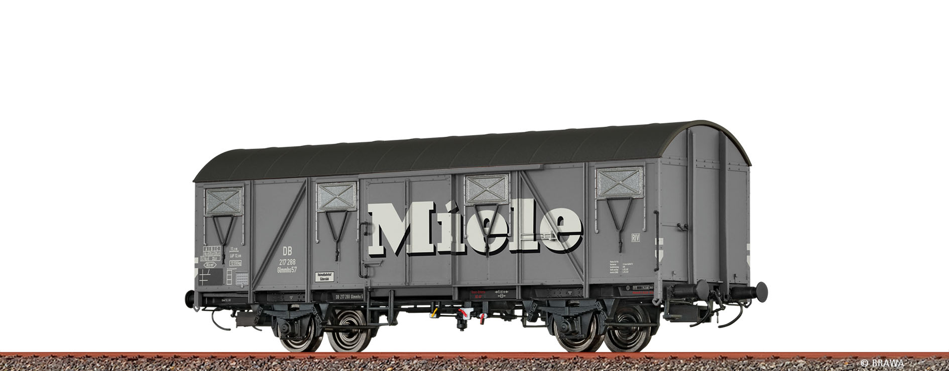 H0 Gedeckter Güterwagen Glmmhs57 Miele DB - Epoche III - Betriebsnummer 217 288- Bremsbacken in Radebene - Drehgestell mit Dreipunktlagerung - Extra angesetztes Achsbremsgestänge - Extra angesetzte Bremsanlage - Maßstäblich schmaler Rahmen - Metallachshalter - Radsätze auch innen profiliert - Länge über Puffer: 143,7 mm - Kurzkupplungskinematik: eingebaut - Vorbild: Auf Basis des UIC-Einheitswagens Gmhs 53, entwickelte die DB einen rund 2 m längeren Wagen, der ansonsten in allen Ausrüstungsmerkmalen ebenfalls den UIC-Vorgaben entsprach. Im Gegensatz zu seinem Ausgangstyp, hatte er schon die neu standardisierte 2 m breite Ladetür. Beim UIC konnte man sich zu diesem Zeitpunkt noch nicht auf einen grösseren Standardentwurf einigen, dieser folgte erst später in Form des Glmms 61. So war der als Glm(e)hs 50 bezeichnete Wagen nur wenig länger als die grossräumigen G-Wagen der Vorkriegszeit, was bereits zu Zeiten des Baus viele Kontroversen auslöste. Gefordert wurde bereits damals ein Wagen mit mindestens 12,5 m Ladelänge, so dass die Vergrösserung des Laderaums vielen nicht weit genug ging, während andere der Meinung waren, man hätte sich zu weit von den UIC-Vorgaben entfernt. Trotz all dieser Begleitumstände wurden von 1953 bis 1958 rund 12.000 Wagen gebaut – bis 1954 noch mit Bretterwänden, danach mit Plattenwänden. Rund ein Viertel aller Wagen erhielt eine Handbremse, anfänglich noch mit dem charakteristischen Blechbremserhaus. Mindestens 700 Waggons erhielten eine E-Heizleitung, um im Expressgutverkehr in Reisezügen mitlaufen zu können. Einige Wagen wurden langfristig vermietet und erhielten Werbeaufschriften des entsprechenden Unternehmens. Bis Mitte der 70er-Jahre schieden die Wagen mit Bretterwänden aus oder wurden mit Plattenwänden ausgerüstet. Seit 1965 wurden die Glm(e)hs 50 als Gbrs(-v) 245 bezeichnet. Im Jahr 1980, nachdem die Heizleitungen meist entfallen waren, erfolgte die Umzeichnung zu Gos(-uv) 245. In den 80er-Jahren begann dann die Reduzierung des Bestandes, allerdings wurden größere Bestände an die DR verkauft. 1997 waren noch 35 Wagen im Bestand, die letzten drei wurden 2000 ausgemustert. Miele ist ein eingetragenes Warenzeichen.
