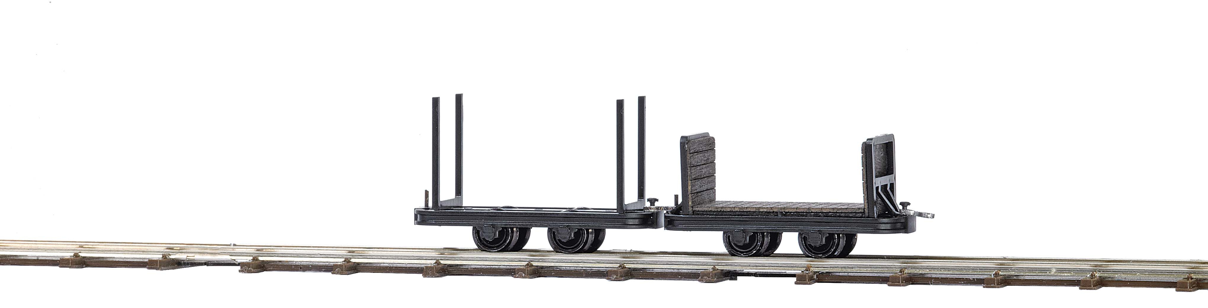 Je ein Rungen- und Stirnwandwagen für die Feldbahn. Länge je Wagen: ca. 29 mm.