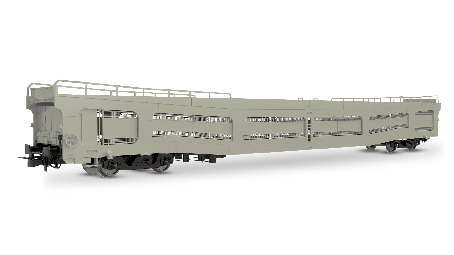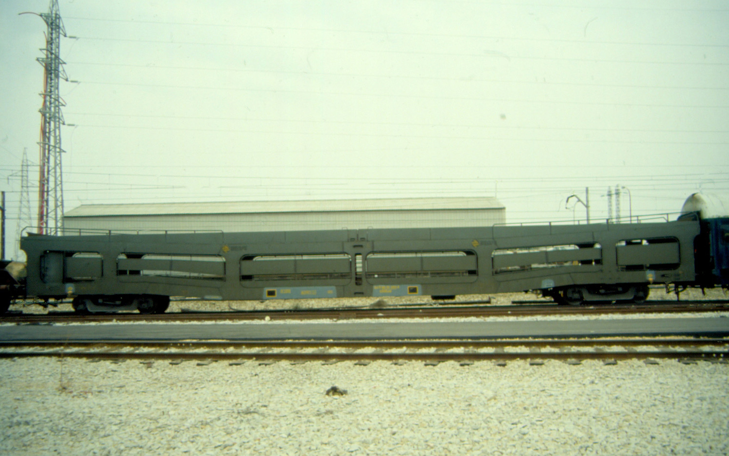 RENFE, 4-achs. Autotransportwagen der Gattung DDMA, graue Farbgebung, mit seitl. Schutzgittern, Ep. IV