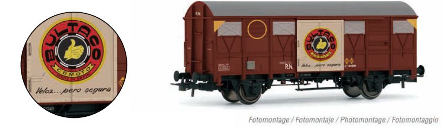 RENFE, 2-axle closed wagon type J2, with advertising for motorcycles ?Bultaco?, ep. IV