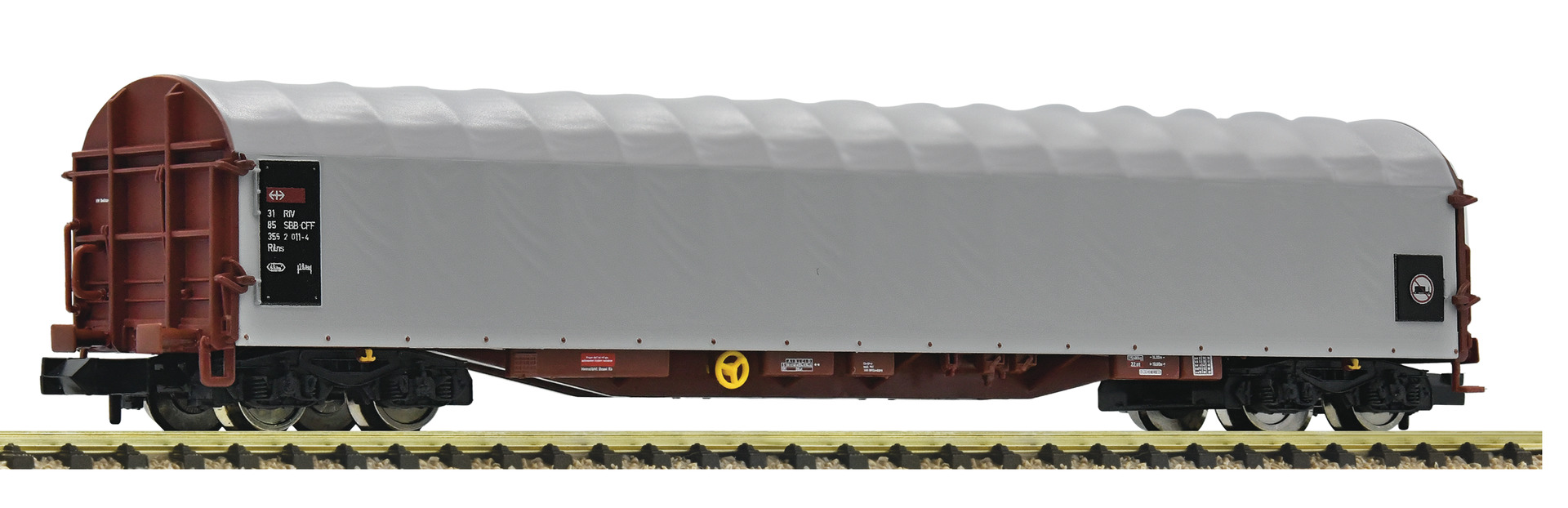 Schiebeplanenwagen, Bauart Rilns, der Schweizerischen Bundesbahnen. - Fein detaillierte Ausführung - Mit separat angesetzten Grifftstangen - Realistische Struktur der Plane Da der Wagen keine Rungen besitzt, übernehmen seitliche Saumleisten von 25 Millimeter Höhe die Sicherung gegen Querverschiebung des meist palettierten Ladegutes. Zusätzlich befinden sich 15 Verzurrösen je Seite an den äußeren Langträgern. Außerdem sind an den Stirnwandinnenseiten in 3.500 Millimeter Höhe weitere Verzurrösen zu finden.