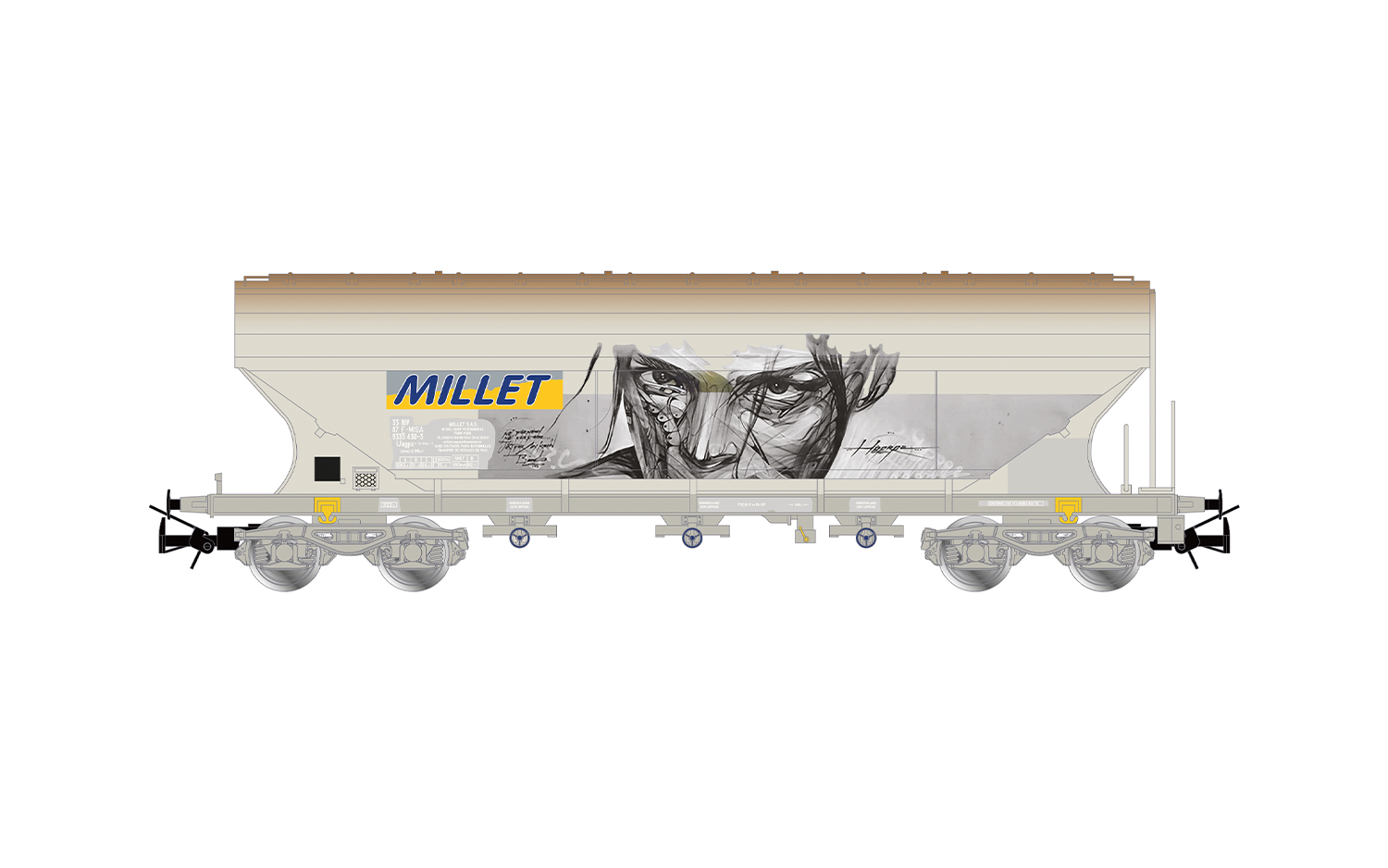 SNCF, 4-achs. Getreidesilowagen mit geraden Seitenwänden, äMILLETö, graue Farbgebung mit Graffiti - HC6100 (10.27 x 25,20 mm)