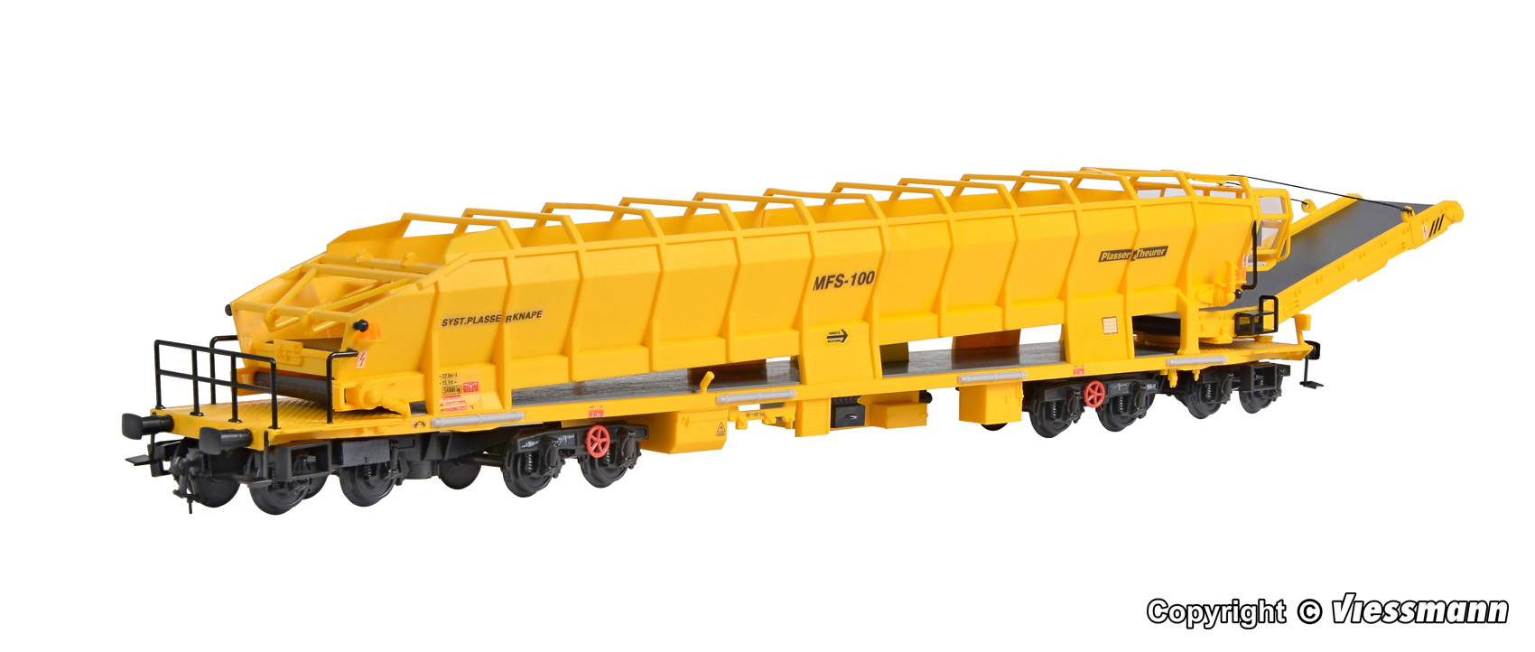 Bausatz. Vorbilddaten: 8-achsige Einheit von PLASSER & THEURER mit 68 m³ Fassungsvermögen, Eigenmasse 54/53,5 t,LüP 22,9 m, Drehzapfenabstand 15,1 m, Motorleistung 126 kW, Fahrgeschwindigkeit gezogen max. 100 km/h. Bei vielen Arbeiten am Gleis, wie z. B. der Bettungsreinigung, fallen beachtliche Mengen an Abraum an. Während man früher die Rückstände üblicherweise seitlich am Bahnkörper ablagerte, muss heute ? nicht zuletzt wegen des gestiegenen Umweltbewusstseins ? der Aushub zu einer geeigneten Entladestelle transportiert werden. In manchen Situationen, wie z. B. im Bahnhofsbereich oder im Tunnel, ist eine Abraumverladung zwingend notwendig. Aber auch der rasche und flexible Transport von neuem Schotter zur Baustelle ist eine Aufgabe, die einer praktikablen und damit wirtschaftlichen Lösung bedarf. Die Materialförder- und Siloeinheiten vom Typ MFS sind in Regelfahrzeugbauweise ausgeführt. Der Boden des Speicherbehälters ist als durchgehender Fördergurt ausgebildet. Dieser ermöglicht ein kontinuierliches Füllen des Silos oder das Durchfördern des Materials. Das Übergabeförderband an der Stirnstelle der Maschine kann schwenkbar ausgeführt werden. Das Band kann dann um 45° nach links oder rechts ausgeschwenkt werden. Das Stirnförderband entlädt das Material entweder in die nächste MFS-Einheit (Förderband in Mittelstellung) oder seitlich an geeigneter Stelle (Förderband ausgeschwenkt). Die MFS-Einheiten eignen sich für jede Art von Schüttgut und können zu Materialzügen beliebiger Länge zusammengestellt werden. Alle Förderbänder werden hydraulisch angetrieben. Die Energie dazu liefert ein Dieselmotor. Dazu passt Art. 26264 H0 Schutzwagen mit Auflage für MFS 100 und Container GleisBau, Fertigmodell. Unter Art. 26150 auch als Fertigmodell erhältlich. Mit NEM-Schacht. LüP: 263 mm. Maße: L 31 x B 3,5 x H 4,5 cm. Schwierigkeitsgrad: 3 (Profis).