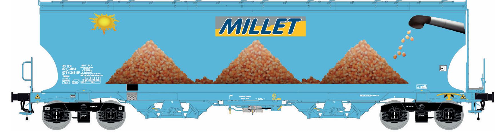 Getreidesilowagen der Bauart Tagnpps der Millet für die Epoche 6 mit neuem Millet Logo.